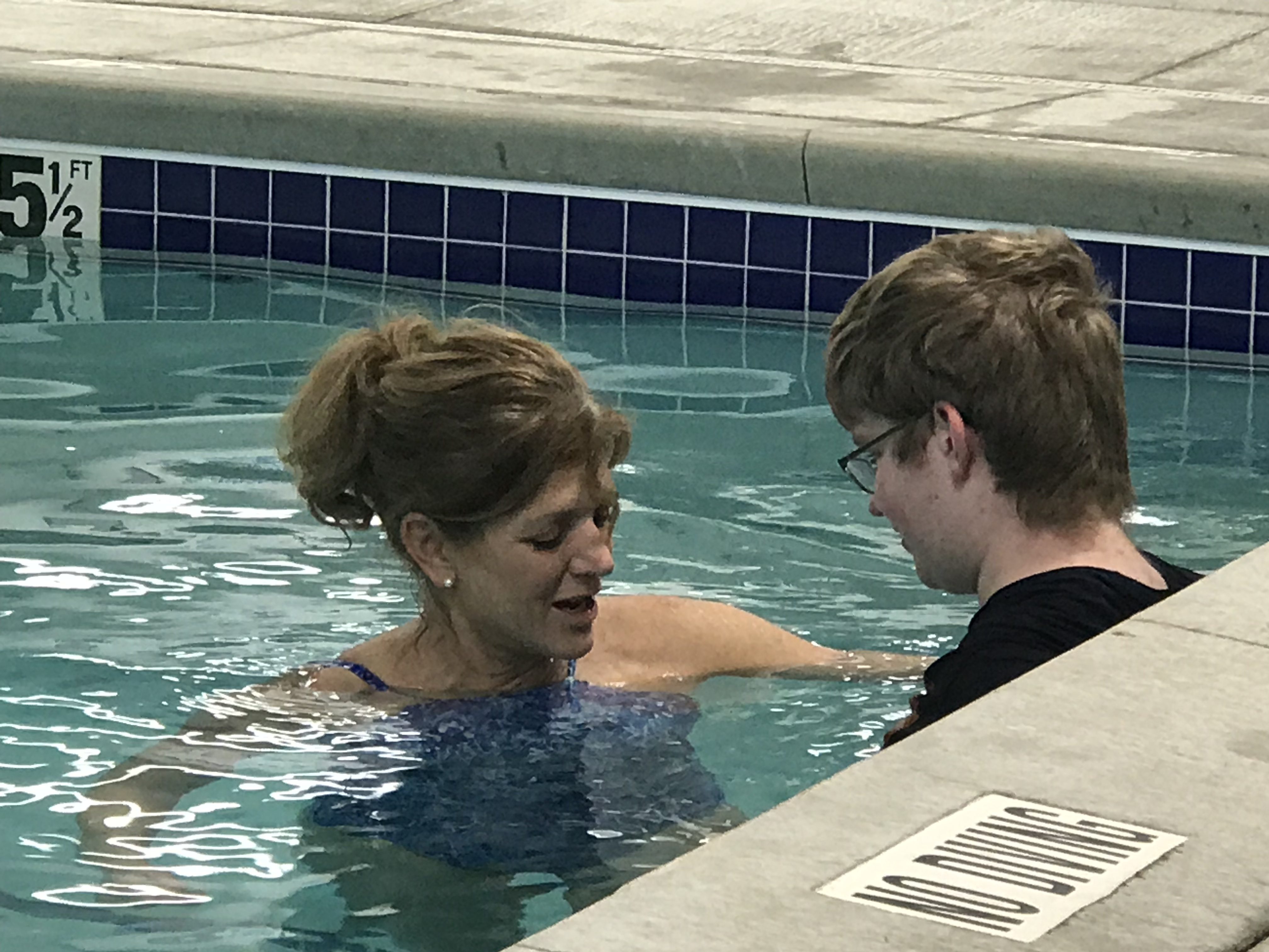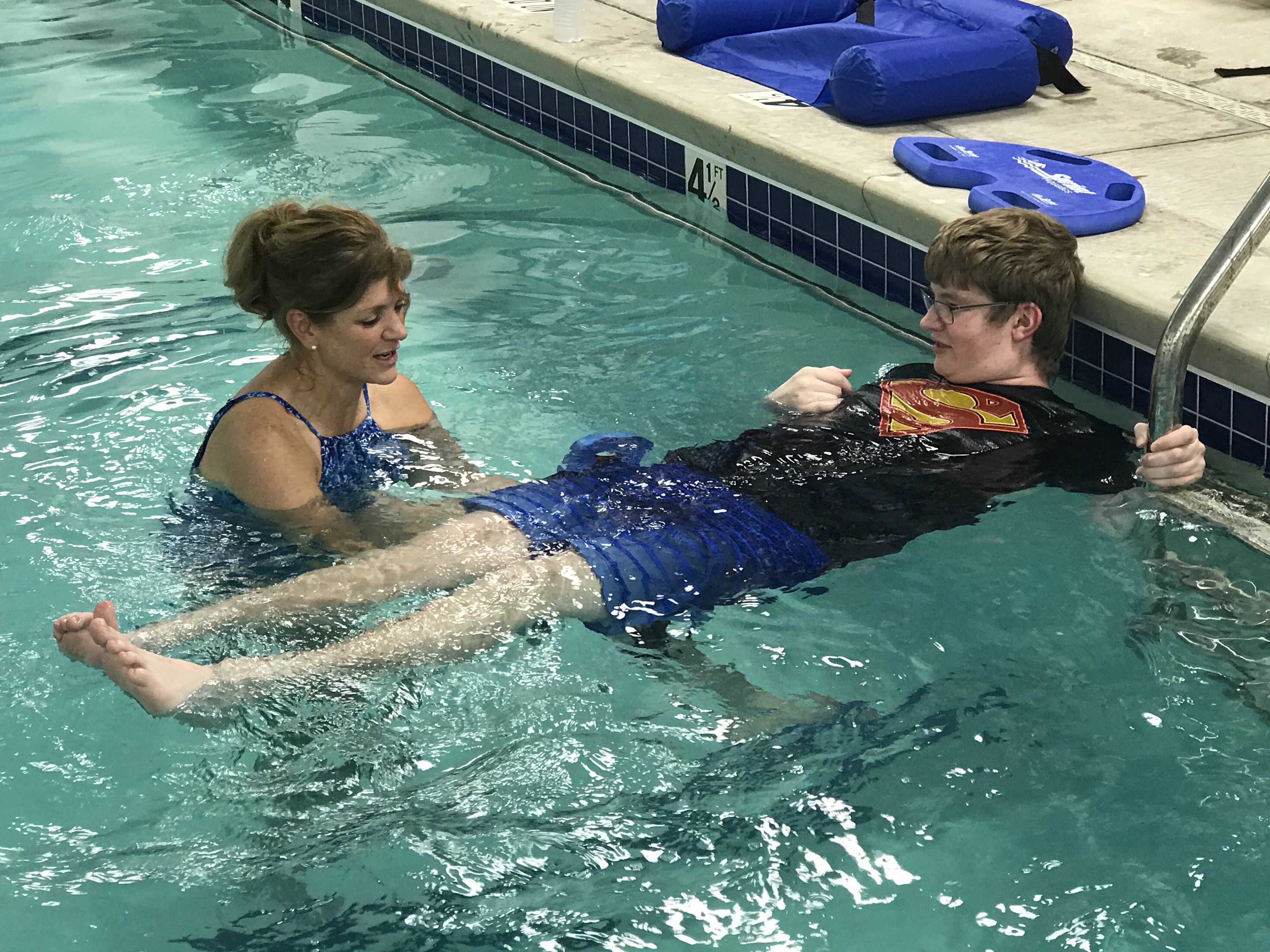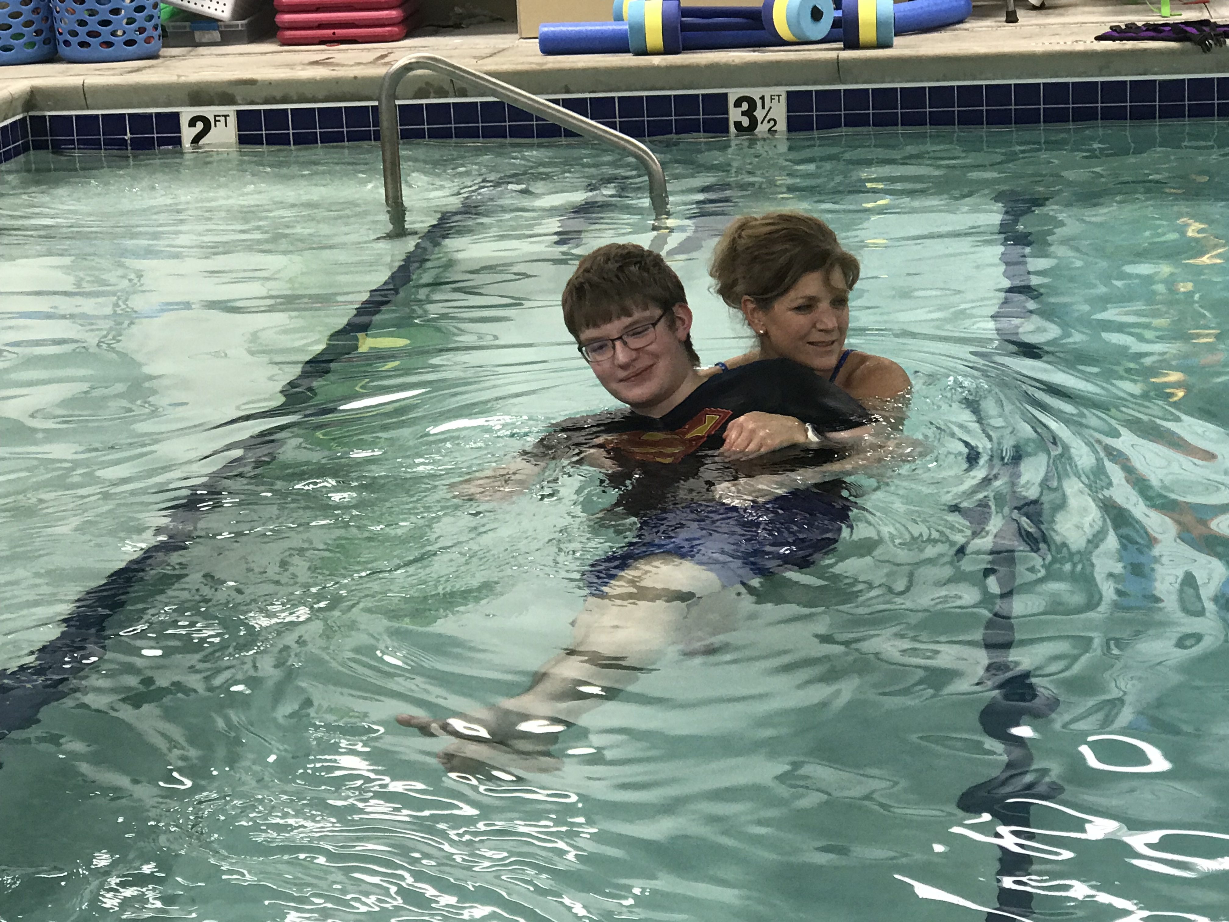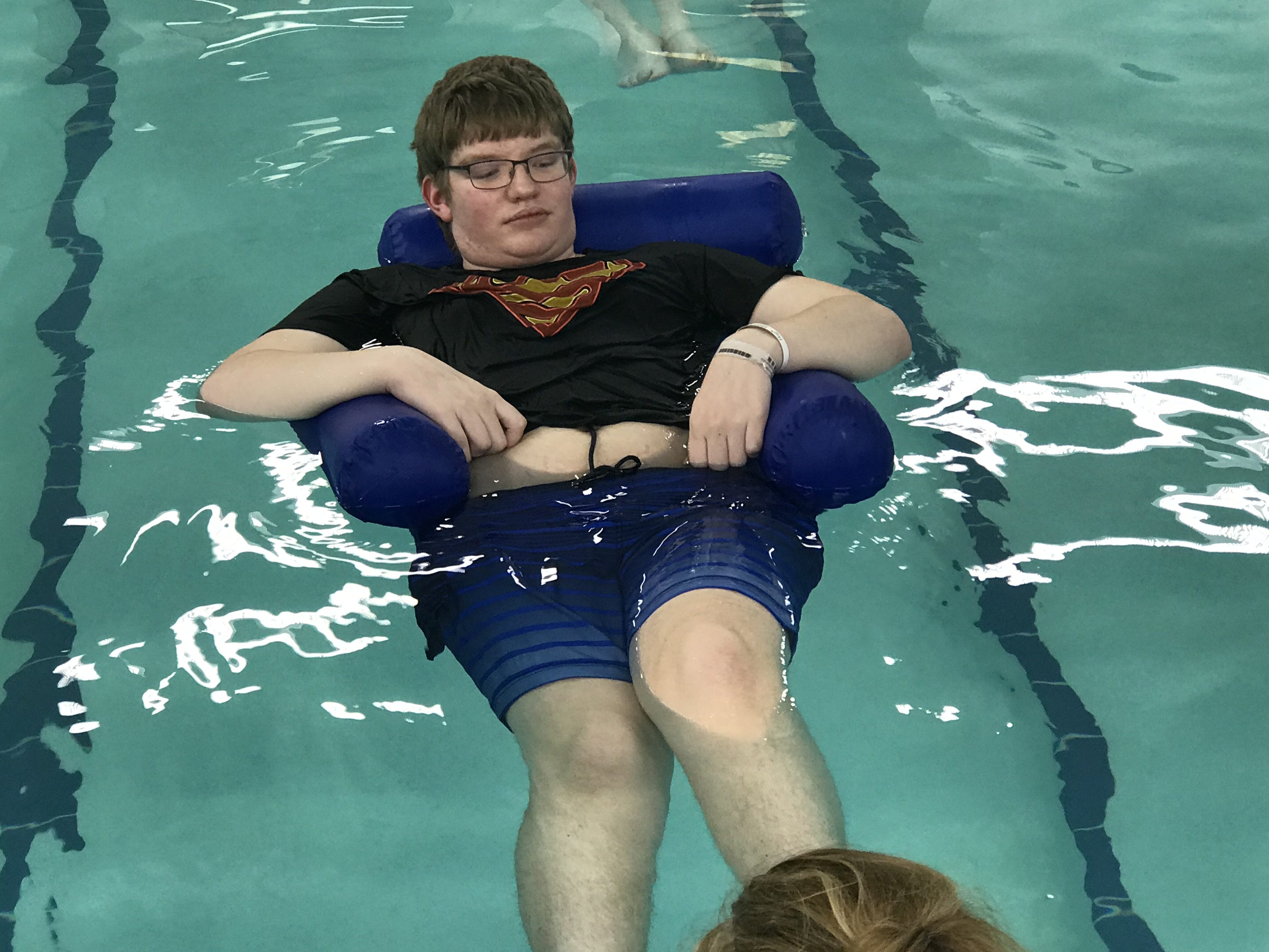 This afternoon, Josh made it down to the therapy pool for his first session in the water. For this, he was moved from his wheelchair to the water with a lift, and then his therapist guided him through different stretches and exercises. These included being pulled slowly across the width of the pool, practice kicking, and arm stretches. Towards the end, he was allowed to float around a little bit on an inflatable chair.